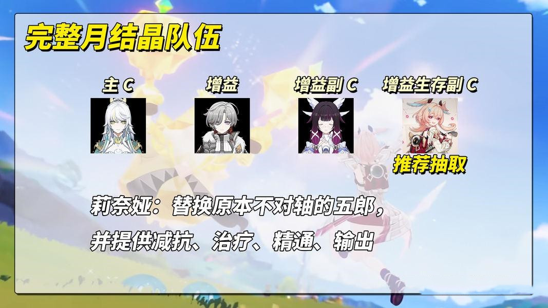 莉奈娅取代了原队伍中的五郎位置,无需再学习缩轴操作,同时还能提供减抗、元素精通、月结晶基础伤害加成、治疗以及副C输出能力。