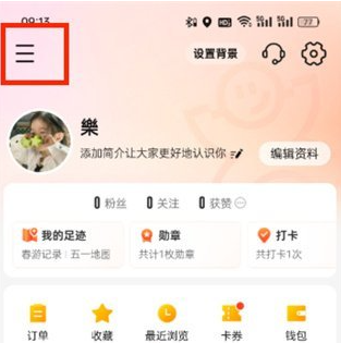 2、在“我的”页面中,可以看到足迹、勋章、打卡等信息,接着点击左上角的【三横图标】。
