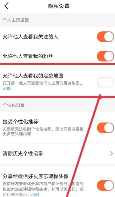 5、找到“允许他人查看我的足迹地图”,将旁边的开关关闭即可。