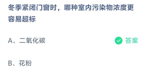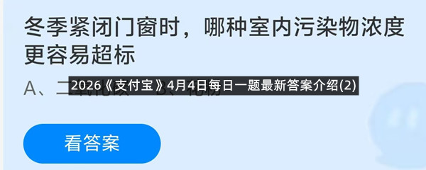 冬季紧闭门窗时,哪种室内污染物浓度更容易超标?这是今天《支付宝》每日一题的问题,相信我们很多用户都很想知道这个问题的答案是什么?这么一个可以领取饲料的机会相信我们很多用户都不想错过,这里羊托游小编为你带来了2026《支付宝》4月4日每日一题最新答案介绍(2)的全部内容,喜欢的小伙伴欢迎点击进入看看吧。