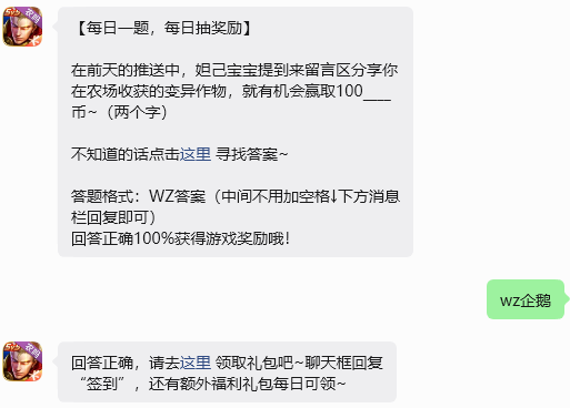 今日问题:在前天的推送中,妲己宝宝提到来留言区分享你在农场收获的变异作物,就有机会赢取100____币~(两个字)