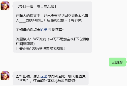 今日问题:在昨天的推文中,妲己宝宝提到司空震&太乙真人____皮肤4月9日开启最终投票~(两个字)