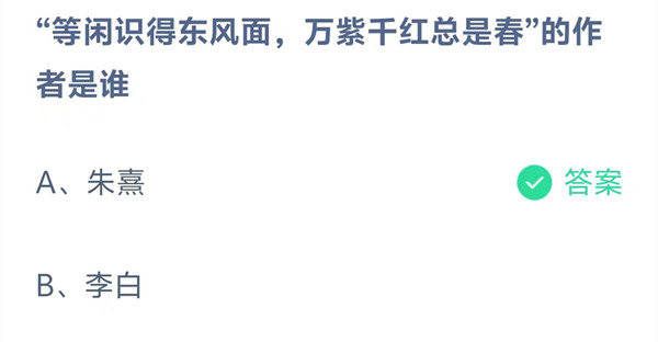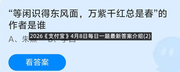“等闲识得东风面,万紫千红总是春”的作者是谁?这是今天《支付宝》每日一题的问题,相信我们很多用户都很想知道这个问题的答案是什么?这么一个可以领取饲料的机会相信我们很多用户都不想错过,这里羊托游小编为你带来了2026《支付宝》4月8日每日一题最新答案介绍(2)的全部内容,喜欢的小伙伴欢迎点击进入看看吧。