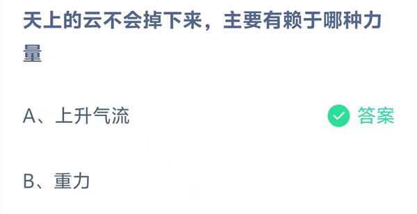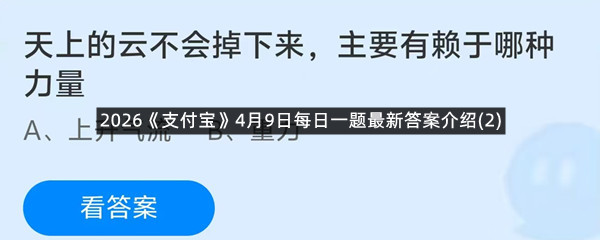 天上的云不会掉下来,主要有赖于哪种力量?这是今天《支付宝》每日一题的问题,相信我们很多用户都很想知道这个问题的答案是什么?这么一个可以领取饲料的机会相信我们很多用户都不想错过,这里羊托游小编为你带来了2026《支付宝》4月9日每日一题最新答案介绍(2)的全部内容,喜欢的小伙伴欢迎点击进入看看吧。