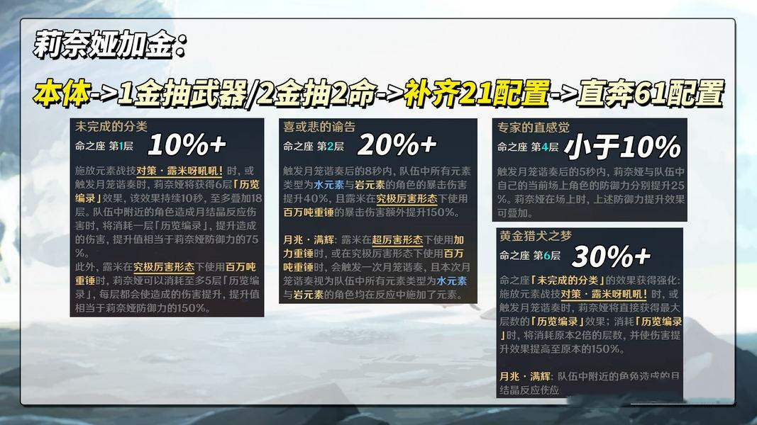 资源充足且追求极限DPS的玩家可考虑6命,但需注意:兹白命座越高,莉奈娅1/2命的收益越有限。