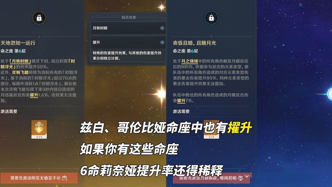 6命:上限命座,全队月结晶伤害提升25%,同时1命效果强化至1.5倍,综合伤害相比0命约提升45.4%。