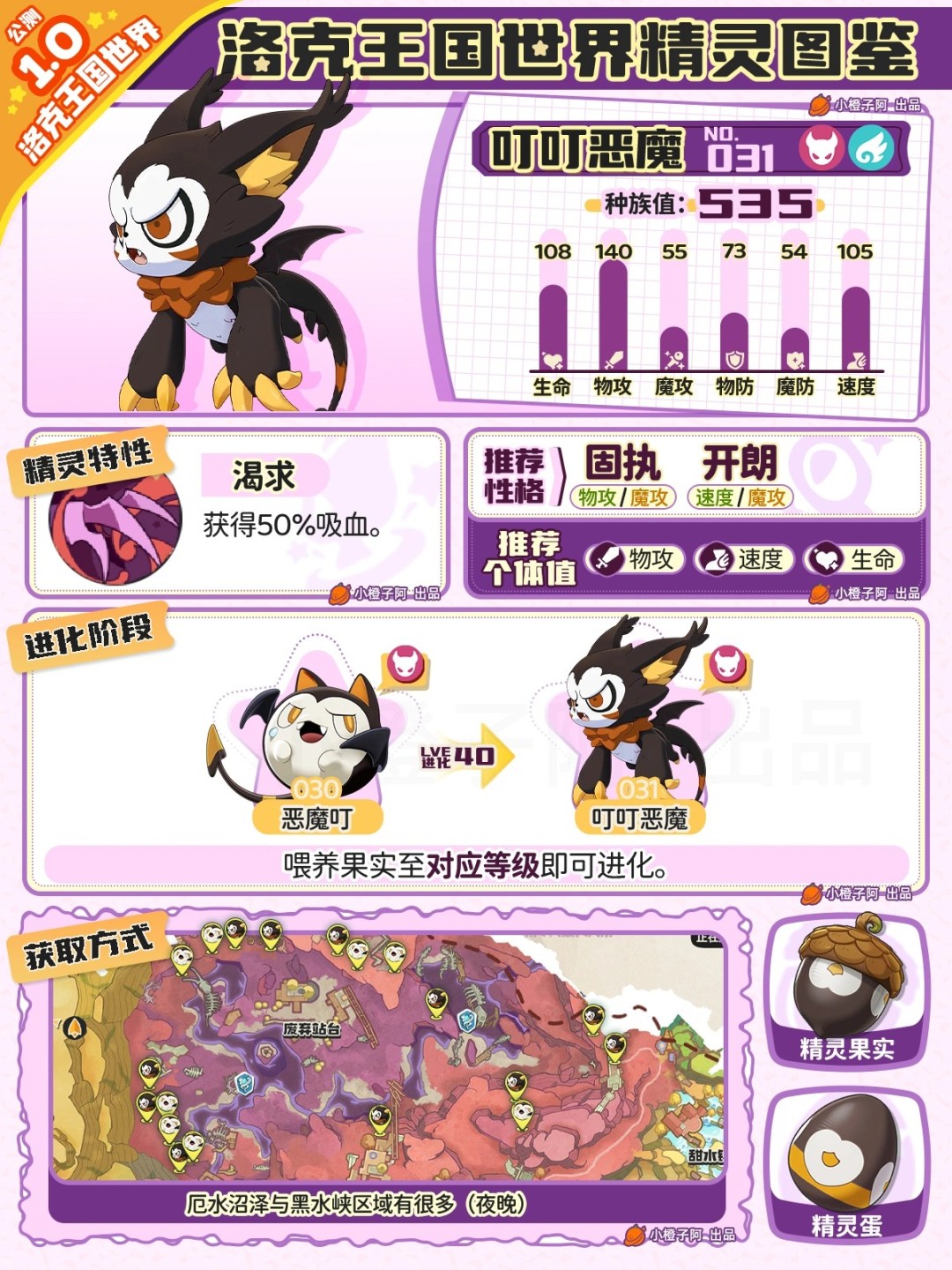 作为一只恶系精灵,它的种族值表现非常出色,进化后可以变为叮叮恶魔。最初的形态是恶魔叮,整体种族值达到486点。该精灵拥有强大的攻击能力,特别是新手攻击技能,可以带来100%的吸血效果。它的进化链有两种不同的形态可供选择。