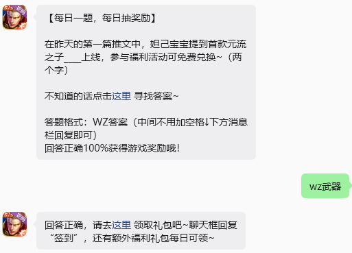 今日问题:在昨天的第一篇推文中,妲己宝宝提到首款元流之子____上线,参与福利活动可免费兑换~(两个字)