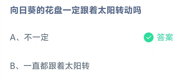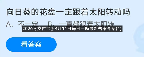 向日葵的花盘一定跟着太阳转动吗?这是今天《支付宝》每日一题的问题,相信我们很多用户都很想知道这个问题的答案是什么?这么一个可以领取饲料的机会相信我们很多用户都不想错过,这里羊托游小编为你带来了2026《支付宝》4月10日每日一题最新答案介绍(1)的全部内容,喜欢的小伙伴欢迎点击进入看看吧。