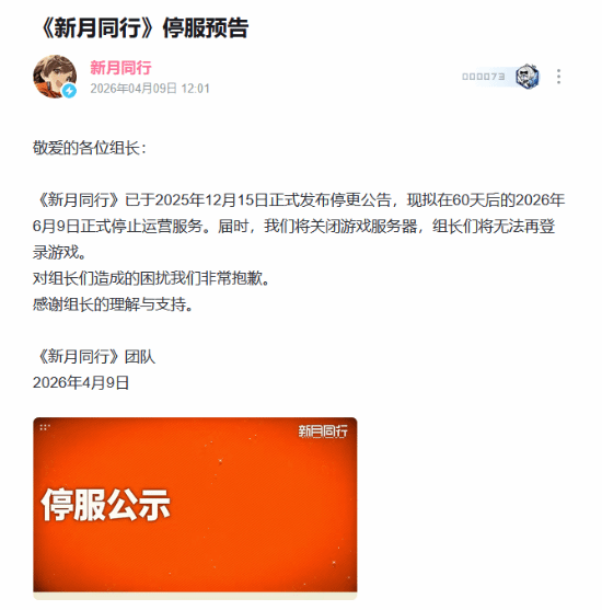 随着服务器正式关闭,《新月同行》的线上服务全面结束,整体运营周期固定在417天。