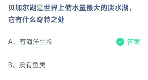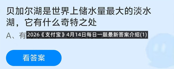 贝加尔湖是世界上储水量最大的淡水湖,它有什么奇特之处?这是今天《支付宝》每日一题的问题,相信我们很多用户都很想知道这个问题的答案是什么?这么一个可以领取饲料的机会相信我们很多用户都不想错过,这里羊托游小编为你带来了2026《支付宝》4月14日每日一题最新答案介绍(1)的全部内容,喜欢的小伙伴欢迎点击进入看看吧。