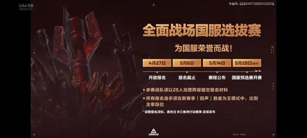 全面战场国服选拔赛及高校打洲杯即将开启,具体赛程与规则可关注官方后续公告。