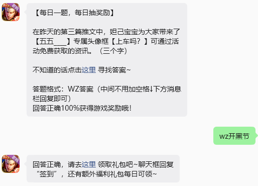今日问题:在昨天的第三篇推文中,妲己宝宝为大家带来了【五五____】专属头像框【上车吗?】可通过活动免费获取的资讯。(三个字)