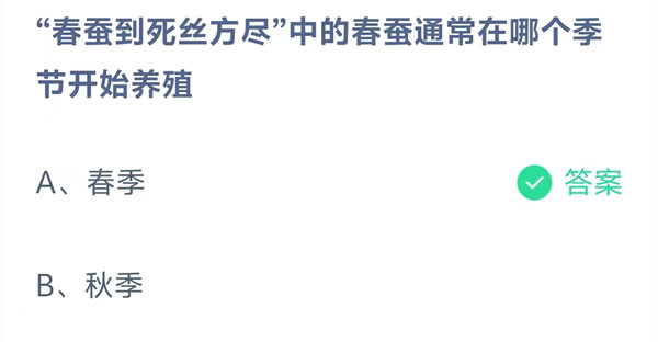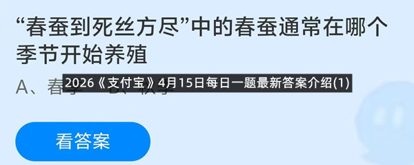 “春蚕到死丝方尽”中的春蚕通常在哪个季节开始养殖?这是今天《支付宝》每日一题的问题,相信我们很多用户都很想知道这个问题的答案是什么?这么一个可以领取饲料的机会相信我们很多用户都不想错过,这里羊托游小编为你带来了2026《支付宝》4月15日每日一题最新答案介绍(1)的全部内容,喜欢的小伙伴欢迎点击进入看看吧。