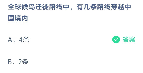 全球候鸟迁徙路线中,有几条路线穿越中国境内?这是今天《支付宝》每日一题的问题,相信我们很多用户都很想知道这个问题的答案是什么?这么一个可以领取饲料的机会相信我们很多用户都不想错过,这里羊托游小编为你带来了2026《支付宝》4月17日每日一题最新答案介绍(1)的全部内容,喜欢的小伙伴欢迎点击进入看看吧。