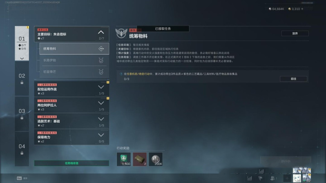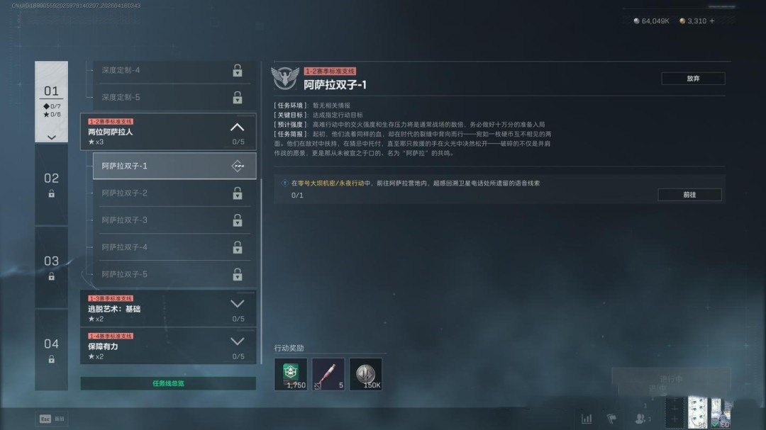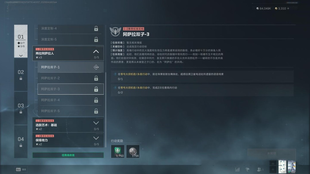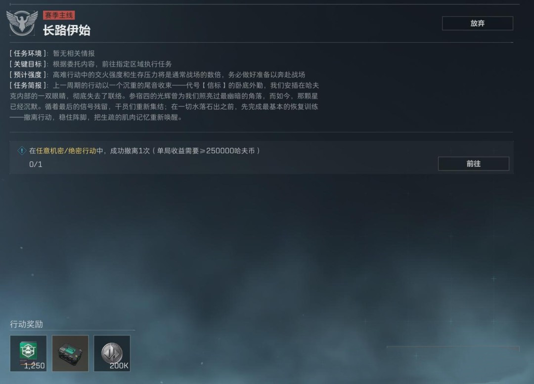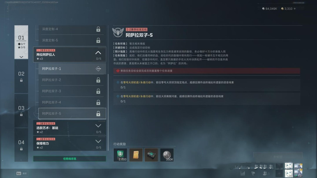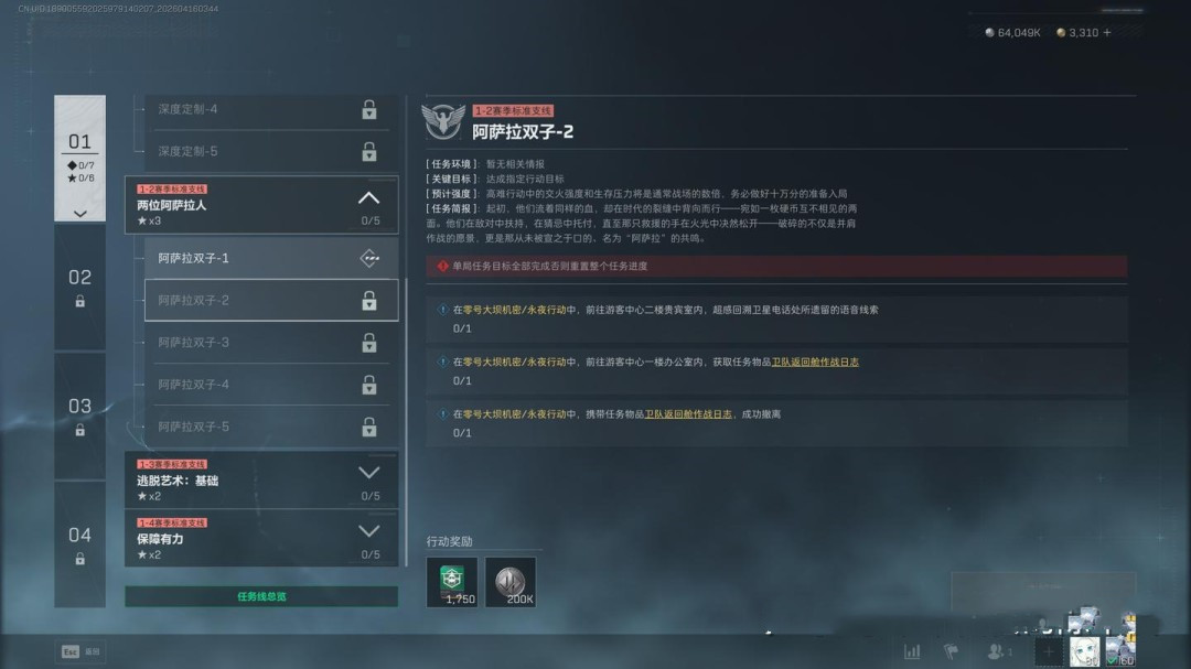 任务要求为穿戴3级及以上的阿萨拉护甲击败2名干员,同时完成指定地点调查、2个局内任务,并带出3个紫色品质物品(这一项可以让队友协助完成)