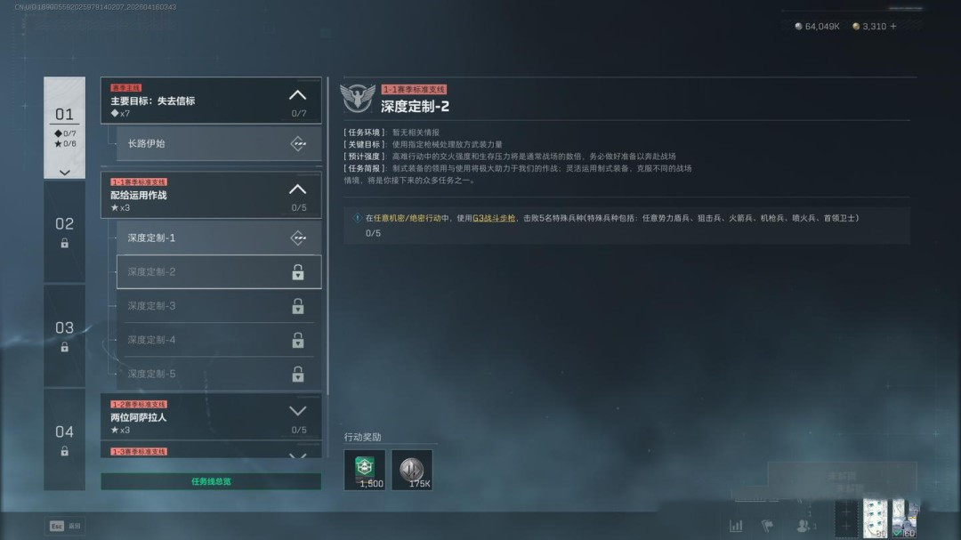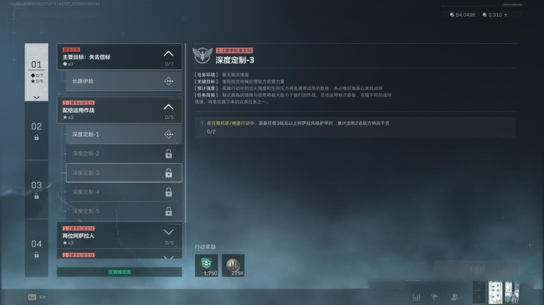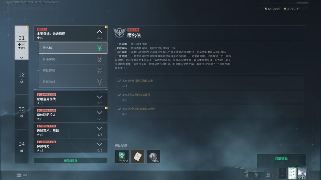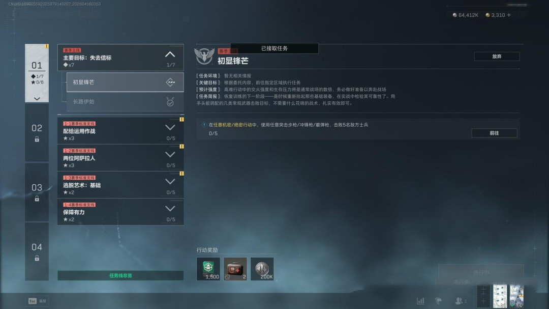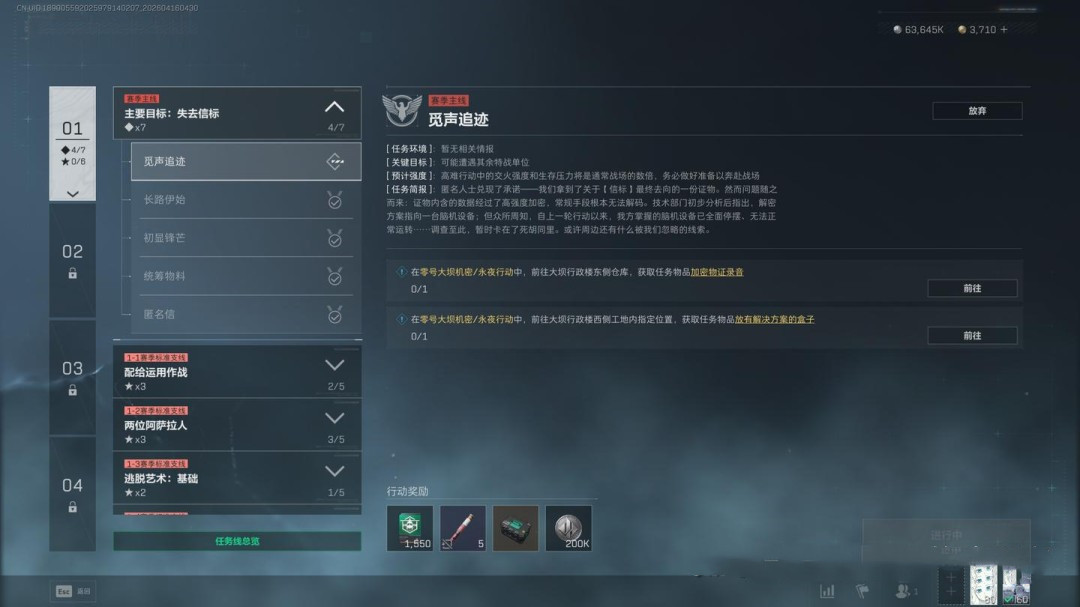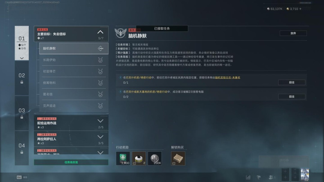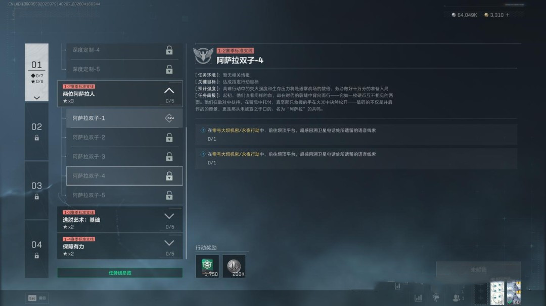 任务要求为穿戴3级及以上的阿萨拉护甲击败2名干员,同时完成指定地点调查、2个局内任务,并带出3个紫色品质物品(这一项可以让队友协助完成)