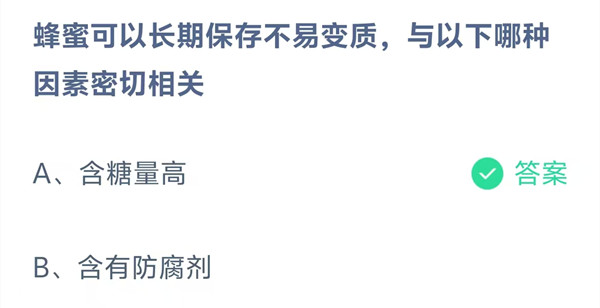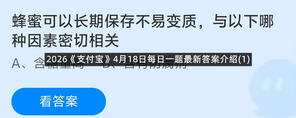 蜂蜜可以长期保存不易变质,与以下哪种因素密切相关?这是今天《支付宝》每日一题的问题,相信我们很多用户都很想知道这个问题的答案是什么?这么一个可以领取饲料的机会相信我们很多用户都不想错过,这里羊托游小编为你带来了2026《支付宝》4月18日每日一题最新答案介绍(1)的全部内容,喜欢的小伙伴欢迎点击进入看看吧。
