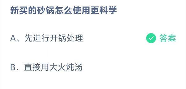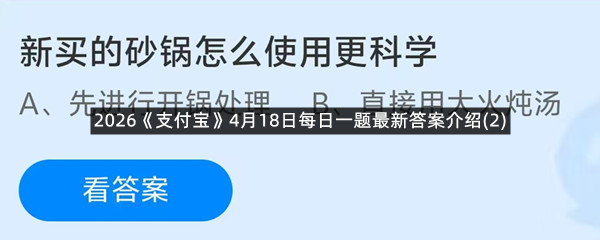 新买的砂锅怎么使用更科学?这是今天《支付宝》每日一题的问题,相信我们很多用户都很想知道这个问题的答案是什么?这么一个可以领取饲料的机会相信我们很多用户都不想错过,这里羊托游小编为你带来了2026《支付宝》4月18日每日一题最新答案介绍(2)的全部内容,喜欢的小伙伴欢迎点击进入看看吧。