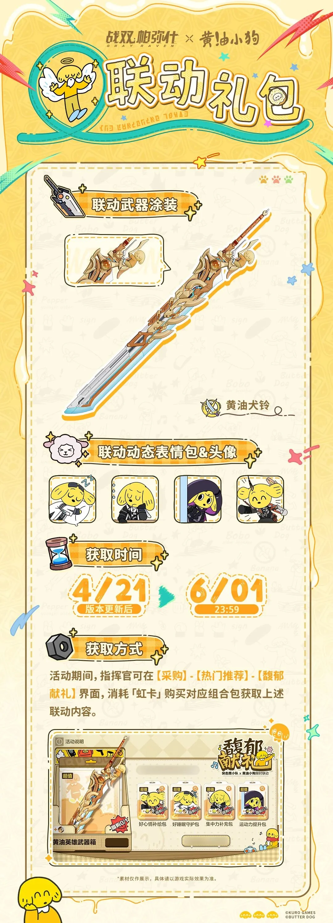 4月21日版本更新至6月1日23:59,指挥官可以使用【馥郁献礼】中的“虹卡”购买相应的礼包。这将授予他们协作武器皮肤“黄油犬铃”,以及协作颜文字和替身。