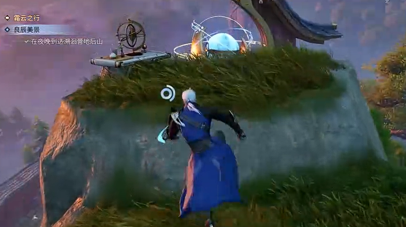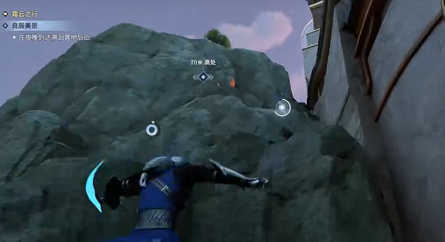 打开地图传送至溯洄营地大都市,朝着蓝色标记的山顶前进,可以从营地外围利用钩锁攀爬上去。