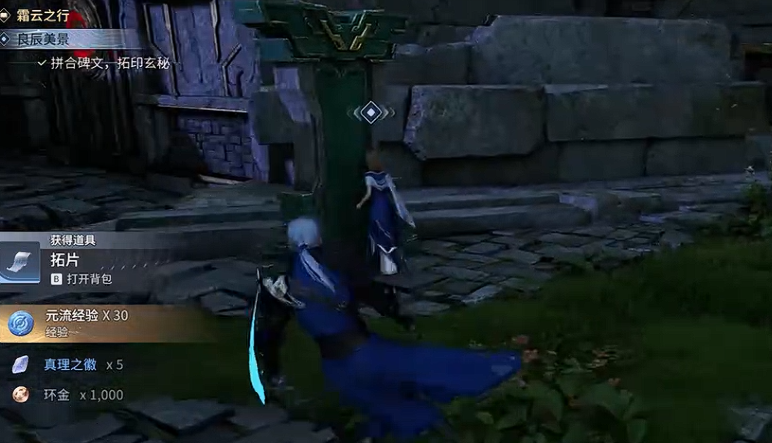 将三块碎片全部放置并完成拼接,进行石碑拓印,等待NPC查看后再次与其对话。