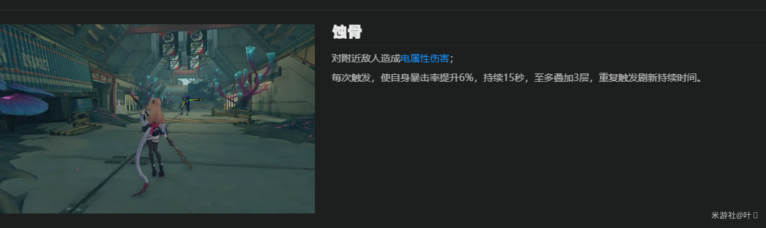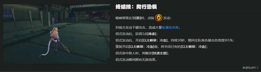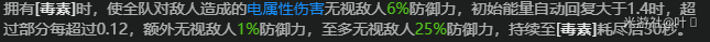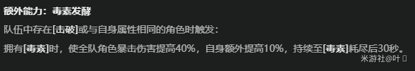 【额外能力】需要队伍中存在击破角色或与其属性一致的角色才能触发,同样与【毒素】机制挂钩。效果为直接提供暴击伤害加成,机制简单明了。