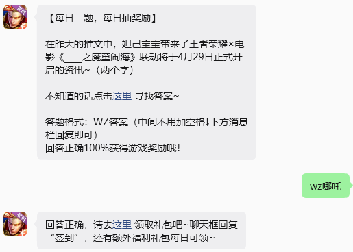 今日问题:在昨天的推文中,妲己宝宝带来了王者荣耀×电影《____之魔童闹海》联动将于4月29日正式开启的资讯~(两个字)