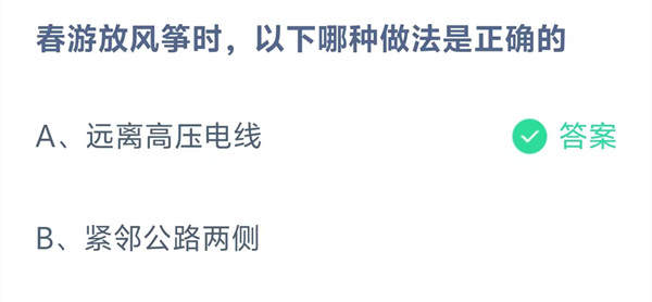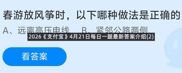 春游放风筝时,以下哪种做法事正确的?这是今天《支付宝》每日一题的问题,相信我们很多用户都很想知道这个问题的答案是什么?这么一个可以领取饲料的机会相信我们很多用户都不想错过,这里羊托游小编为你带来了2026《支付宝》4月21日每日一题最新答案介绍(2)的全部内容,喜欢的小伙伴欢迎点击进入看看吧。