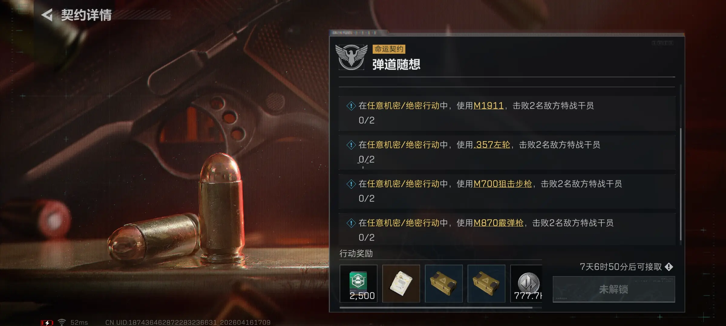 在任意机密/绝密行动中,使用M1911,击败2名敌方特战干员。