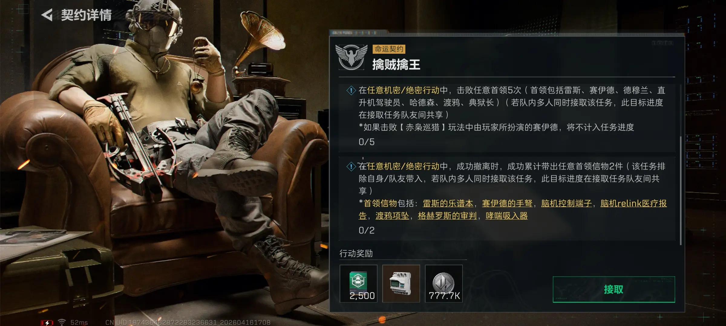 在任意机密/绝密行动中,成功撤离时,成功累计带出任意首领信物2件(该任务排除自身/队友带入,若队内多人同时接取该任务,此目标进度在接取任务队友间共享)