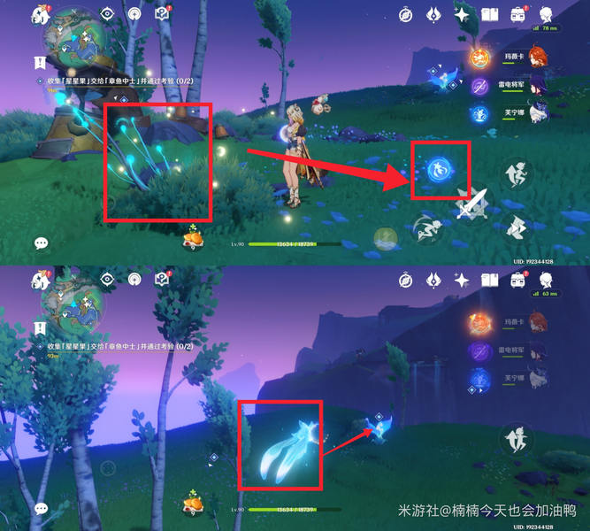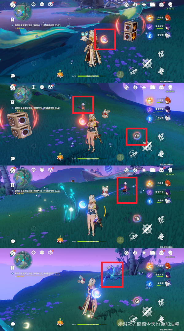 解密的关键在于将红蓝能量球打向那些闭合的植株,使它们舒展叶子,进而获得星星果。由于某些解密方法比较复杂或没有固定顺序,且重复的部分不再详细说明,旅行者们可以根据具体情况操作。