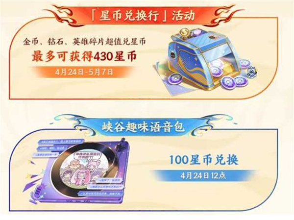 除了外观内容,本次还同步开启了“星币兑换行”活动。玩家可以使用金币、钻石以及英雄碎片等资源进行兑换,累计最多可获取430星币,用于兑换各类道具。