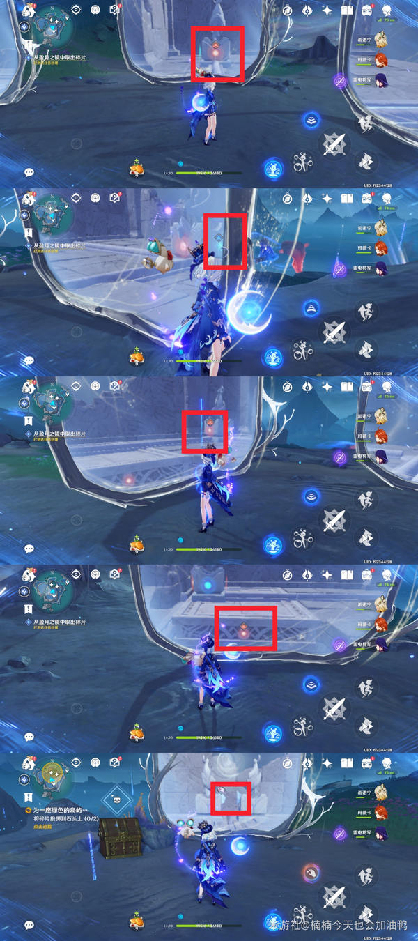 此处先将石像拉到指定位置,然后沿轨道绕一圈,最后移动所在的石块,当两个石像靠在一起时会生成两个碎片