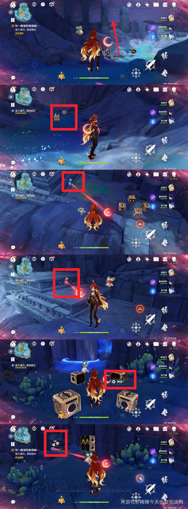 深入洞穴,收集碎片,同时注意屏幕上跟随外面旋转的两块漂浮大石头,这样就可以与碎片进行交互。这样的碎片一共需要收集四个。