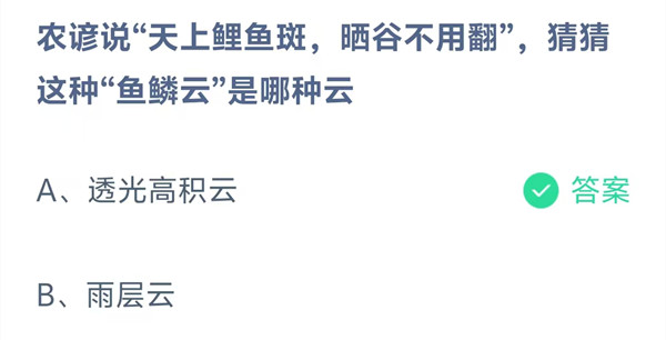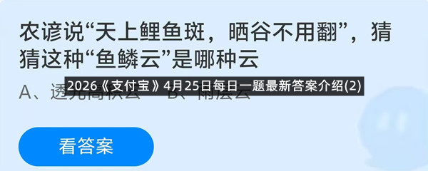 农谚说“天上鲤鱼斑,晒谷不用翻”,猜猜这种“鱼鳞云”是哪种云?这是今天《支付宝》每日一题的问题,相信我们很多用户都很想知道这个问题的答案是什么?这么一个可以领取饲料的机会相信我们很多用户都不想错过,这里羊托游小编为你带来了2026《支付宝》4月25日每日一题最新答案介绍(2)的全部内容,喜欢的小伙伴欢迎点击进入看看吧。