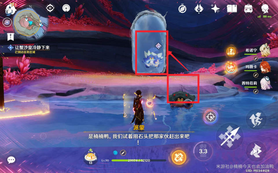 再说一下后续任务流程,同样需要击败这只大螃蟹,不过打法有所不同,需要利用螃蟹身上的碎石去攻击镜子中的那只大螃蟹