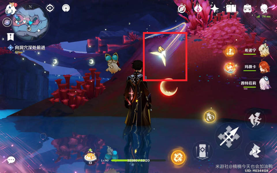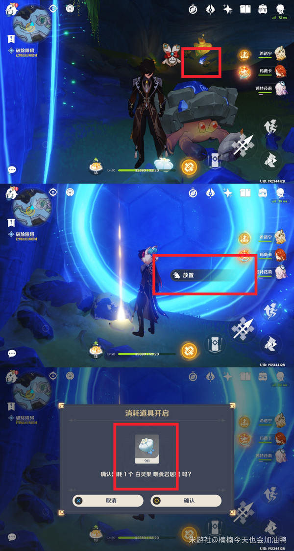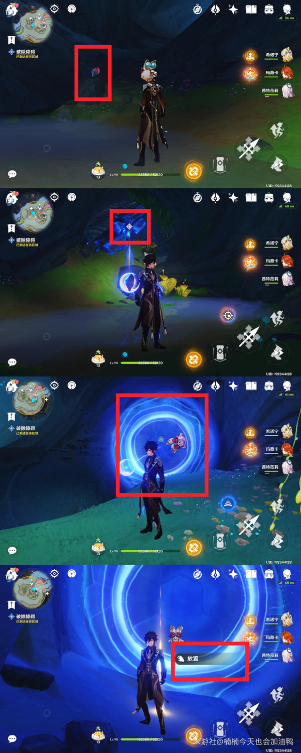 接着继续往里走,这一段的解密方式依旧类似:用碎片打碎石头,借助月矩粒来破除屏障,再进行放置操作
