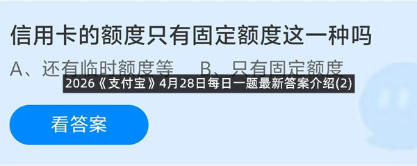 信用卡的额度只有固定额度这一种吗?这是今天《支付宝》每日一题的问题,相信我们很多用户都很想知道这个问题的答案是什么?这么一个可以领取饲料的机会相信我们很多用户都不想错过,这里羊托游小编为你带来了2026《支付宝》4月28日每日一题最新答案介绍(2)的全部内容,喜欢的小伙伴欢迎点击进入看看吧。