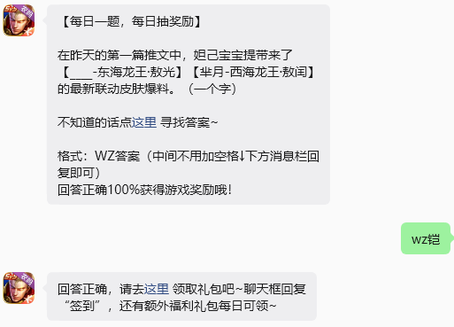 今日问题:在昨天的第一篇推文中,妲己宝宝提带来了【____-东海龙王·敖光】【芈月-西海龙王·敖闰】的最新联动皮肤爆料。(一个字)