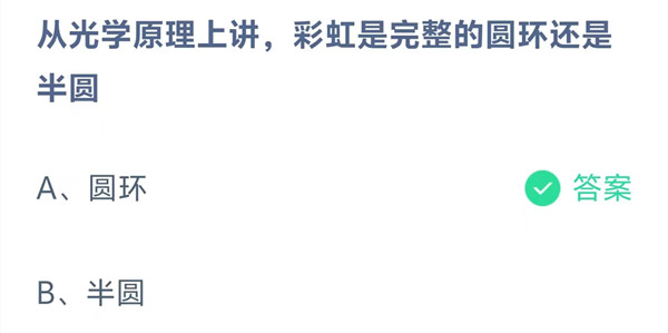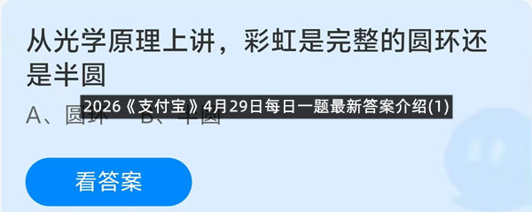 从光学原理上讲,彩虹是完整的圆环还是半圆?这是今天《支付宝》每日一题的问题,相信我们很多用户都很想知道这个问题的答案是什么?这么一个可以领取饲料的机会相信我们很多用户都不想错过,这里羊托游小编为你带来了2026《支付宝》4月29日每日一题最新答案介绍(1)的全部内容,喜欢的小伙伴欢迎点击进入看看吧。