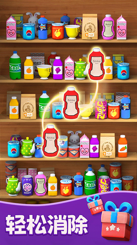 3、货柜爱消除由各种形式和颜色组成,用三连匹配的方法消除它们,获得更高的分数。