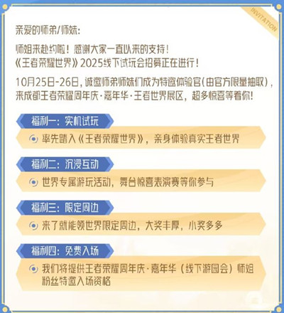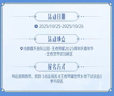 本次试玩活动将在线下进行,线下行程所产生的费用还需您自理,我们将提供王者荣耀周年庆·嘉年华(线下游园会)的入场资格,请确认可以参与再报名。
