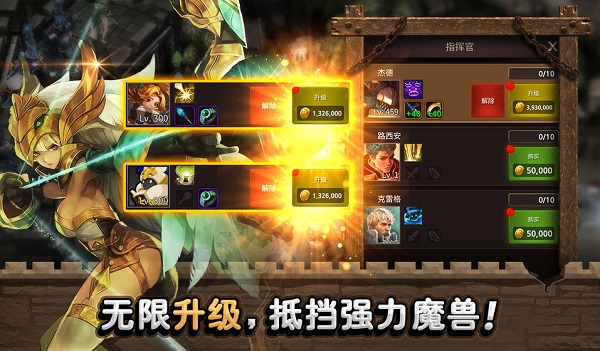 2、在城堡英雄这里,角色可以无限次升级,让你轻松抵抗强大的怪物。