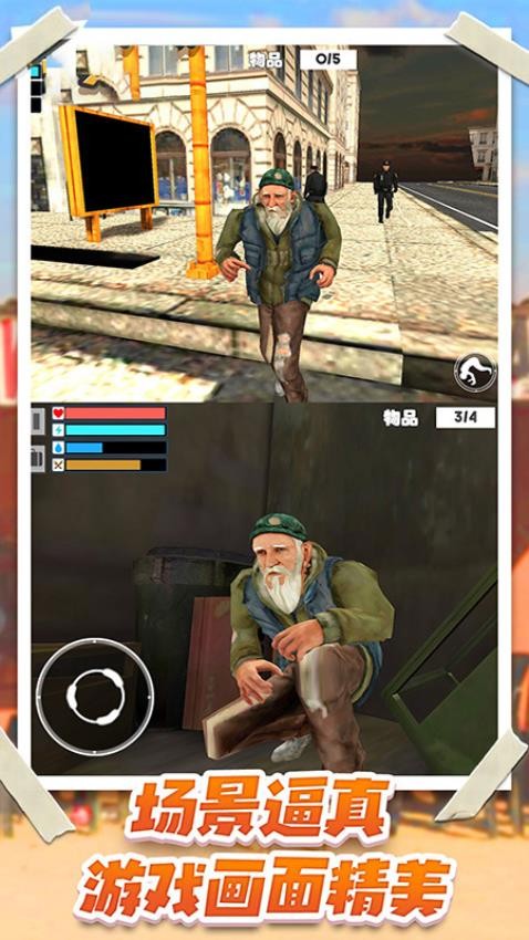 乞丐人生模拟器是一个现实的角色扮演游戏。游戏将以3D图形呈现乞丐生存的真实场景。玩家将以乞丐的形象进入游戏关卡。故事从一个普通的欧洲小镇开始。你扮演的乞丐随着岁月的流逝逐渐变老,满头白发,留着浓密的白胡子。在这里,有一个足够逼真的天气系统,可以真实模拟乞丐暴露在风和太阳下,温饱不足的生活。