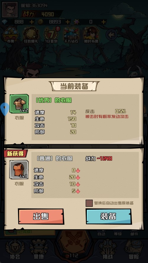 3、击败敌人有概率掉落装备,界面中绿色箭头标注的是更高等级装备,可直接替换;红色箭头为低级装备,建议出售兑换金币。