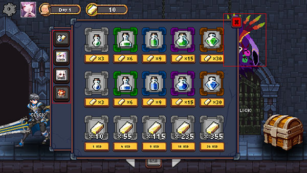 1、进入游戏后,点击右上方漂浮的魔怪图标,就可以购买各种药剂、角色和礼品,这里相当于游戏中的商店系统。