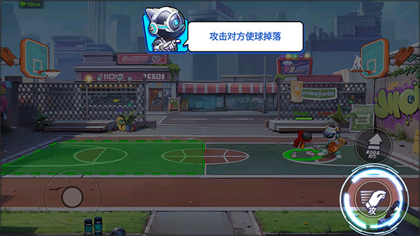 1、先下载安装好灌篮军团,进入游戏的新手教学界面,使用左边的轮盘来控制角色移动,靠近篮球即可自动捡起。