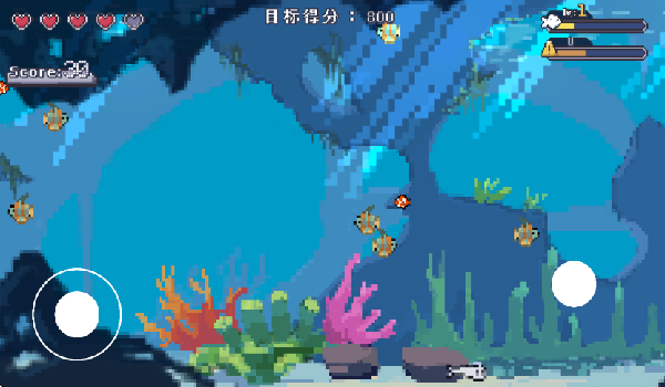 4、游动时要时刻注意走位,如果被大鱼吃掉就会失去一条命,左上角的红心消失意味着闯关失败。