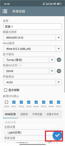2、在创建容器的界面中,直接点击【√】按钮,就能够完成模拟器容器的创建过程。